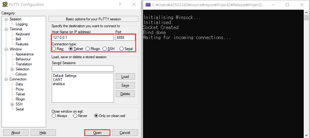연결 대기 중인 8888포트로 telnet 연결을 시도하면 클라이언트 프로그램은 “Connection accepted” 메시지와 함께 프로세스가 종료된다.
