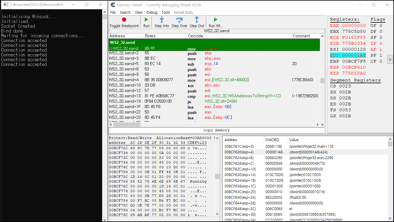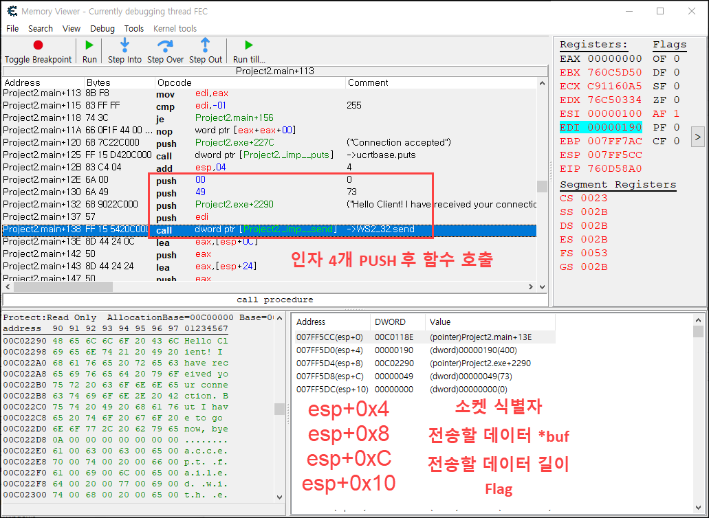 화면 우측 하단의 스택 영역에서는 함수의 두 번째 인자인 데이터 버퍼의 주소(0x00C02290)를 확인할 수 있다.