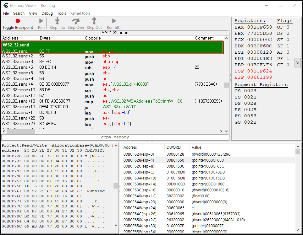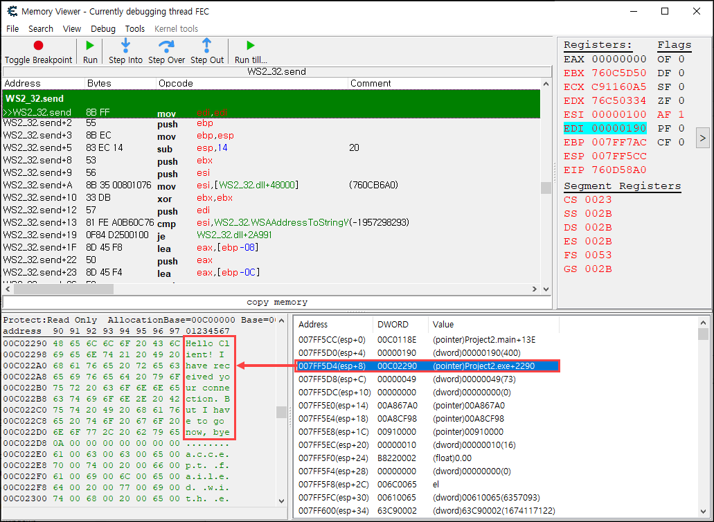 화면 우측 하단의 스택 영역에서는 함수의 두 번째 인자인 데이터 버퍼의 주소(0x00C02290)를 확인할 수 있다.