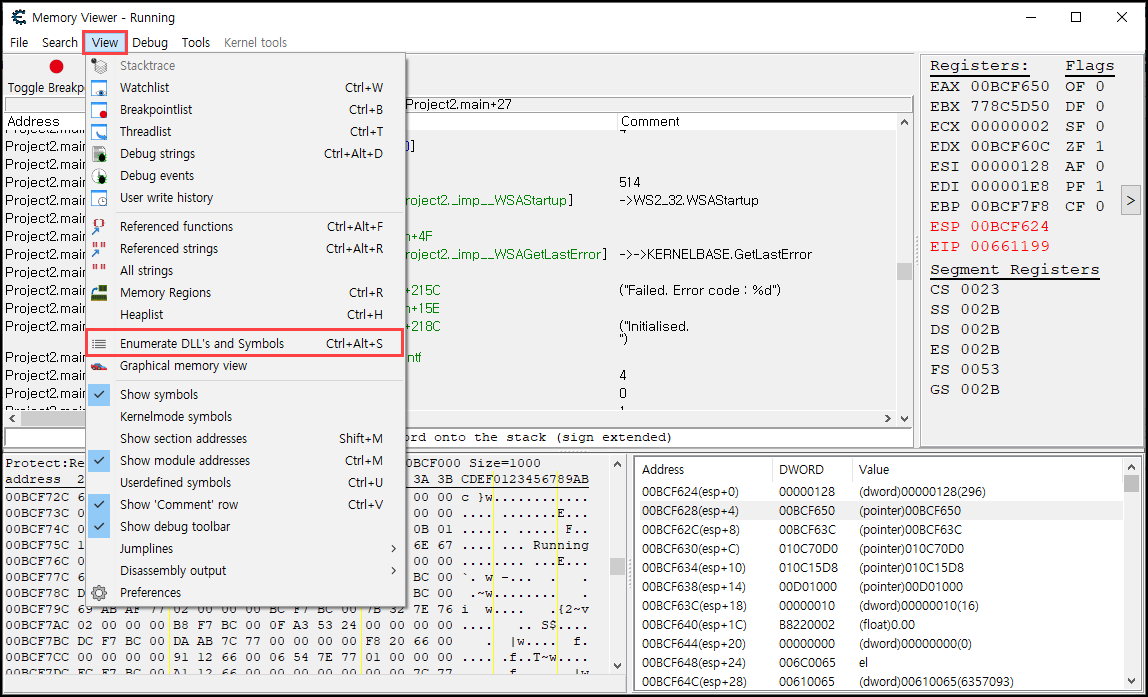 2. [Memory View] - [View] - [Enumerate DLL’s all Symbols]