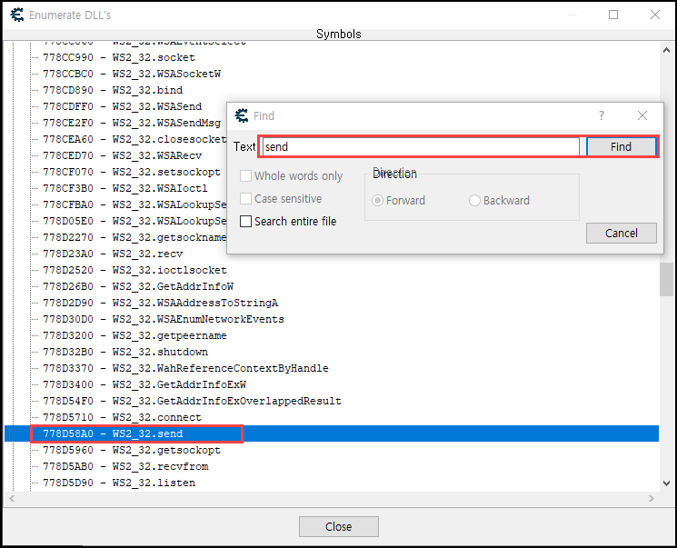 3. 찾기[Ctrl + F] - “Send” 검색 - WS2_32.send 더블클릭