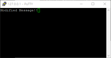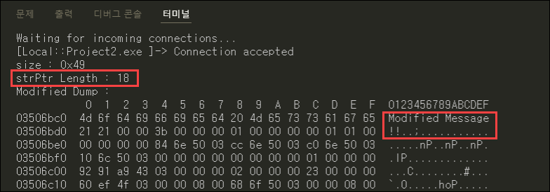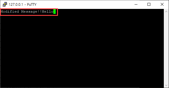 Modified Message!! 뒤에 기존 문자열의 5번째 글자까지 출력된 “Hello” 가 이어서 전송된 것을 확인할 수 있다.