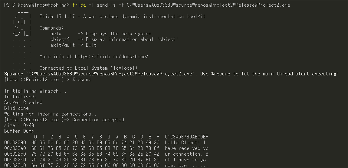 두 번째 인자에 전송할 데이터가 담겨 있으므로 args[1]번지에 값을 hexdump로 출력한다.