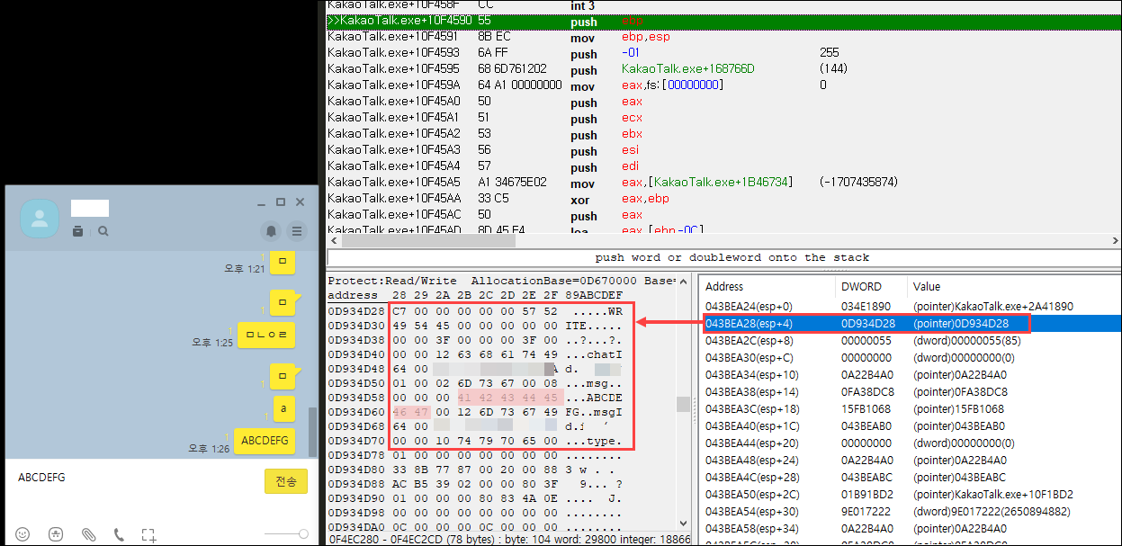 4~5번 정도 반복하다 보면 입력한 메시지를 평문으로 확인할 수 있는 함수가 나타난다. 첫 번째 인자가 전송할 데이터, 두 번째 인자가 길이인 것을 추측할 수 있다. Windows DLL에서 로드하여 실행한 함수가 아니기 때문에 심볼 등을 확인할 수는 없지만 함수의 동작과정과 인자를 통해서 추측가능하다.