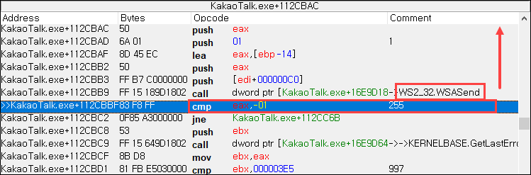 따라서 WSASend 이전에 문자열을 처리, 가공하는 다른 함수들의 실행 이전의 값을 분석해야 원래 메시지 데이터를 확인할 수 있다.
