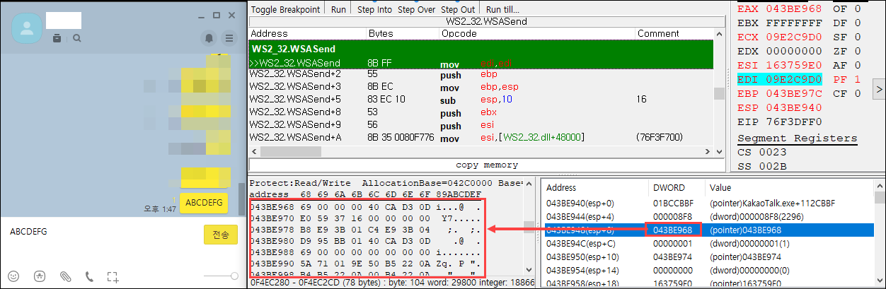 Break Point(F5)를 걸고 메시지를 보내거나, 프로그램을 사용하면 WSASend()함수를 호출하는 순간 프로그램이 멈추면서 호출 시점의 인자를 확인할 수 있다.