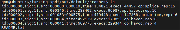 퍼징을 진행하다보면 크래시가 발생하고 크래시가 발생한 파일은 $HOME/fuzzing_xpdf/out/ 경로에 저장된다. Ctrl+C를 이용하여 퍼저를 중지할 수 있고 경로에 들어가서 파일을 분석해볼 수 있다.