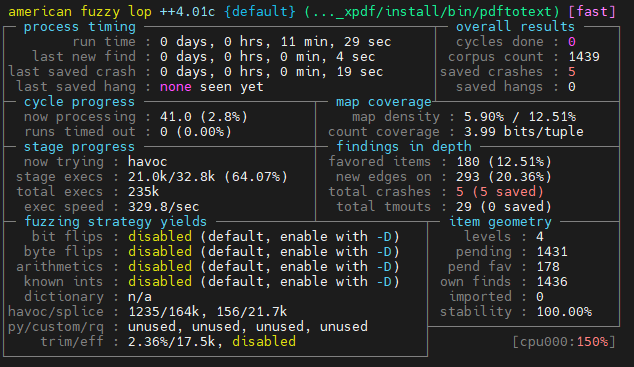 afl-fuzz -i $HOME/fuzzing\_xpdf/pdf\_examples/ -o $HOME/fuzzing\_xpdf/out/ -s 123 -- $HOME/fuzzing\_xpdf/install/bin/pdftotext @@ $HOME/fuzzing\_xpdf/output