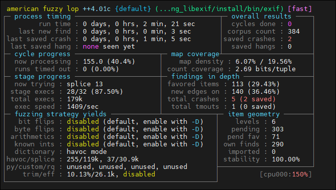 afl-fuzz -i $HOME/fuzzing_libexif/exif-samples-master/jpg/ -o $HOME/fuzzing_libexif/out/ -s 123 -- $HOME/fuzzing_libexif/install/bin/exif @@