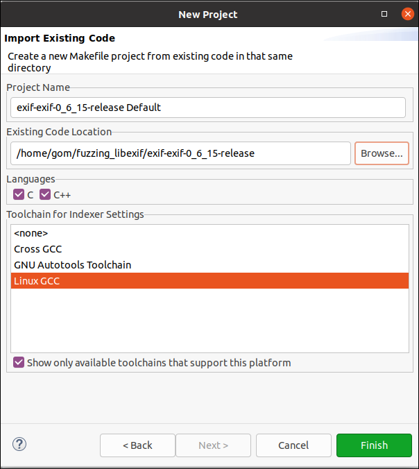“Linux GCC” 선택 > exif 소스코드 폴더 로드