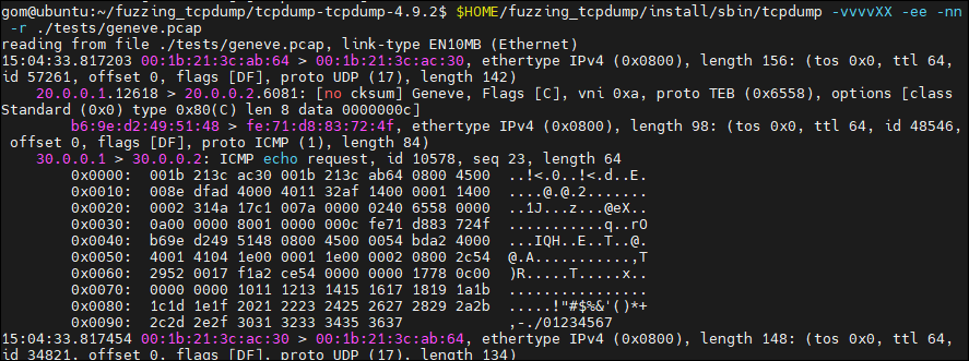 $HOME/fuzzing_tcpdump/install/sbin/tcpdump -vvvvXX -ee -nn -r '/home/antonio/fuzzing_tcpdump/out/default/crashes/id:000001,sig:06,src:010578,time:24952968,execs:15373398,op:havoc,rep:4’
