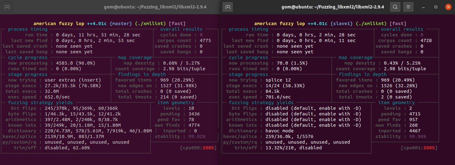 이를 위해 여러 터미널 창에서 “afl-fuzz” 인스턴스만 실행하면 되며, 각각의 터미널 창에 대해 서로 “output” 폴더를 설정할 수 있다. 간단한 방법은 코어의 수만큼 퍼징 작업을 실행한다.