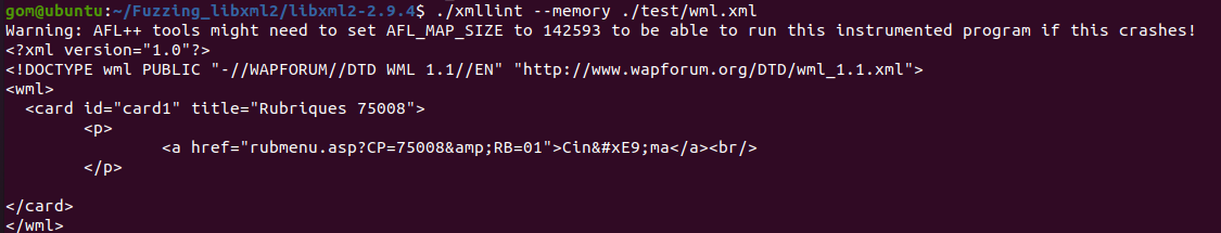 afl-fuzz -m none -i ./afl_in -o afl_out -s 123 -x ./dictionaries/xml.dict -D -M master -- ./xmllint --memory --noenc --nocdata --dtdattr --loaddtd --valid --xinclude @@