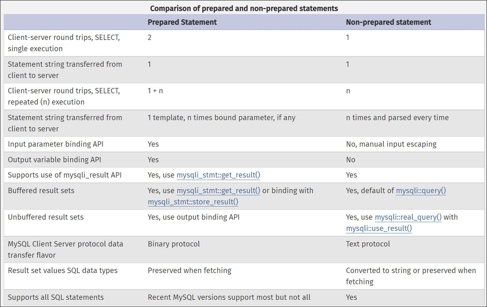 바인딩된 변수는 쿼리와 별도로 서버로 전송되므로 사용자가 입력한 구문이 쿼리로 실행될 수가 없다. 서버는 쿼리 템플릿이 모두 분석된 이후 실행 시점에서 사용자 입력값을 사용한다. 바인딩된 매개변수는 쿼리 문자열로 삽입되지 않으므로 이스케이프할 필요가 없다.