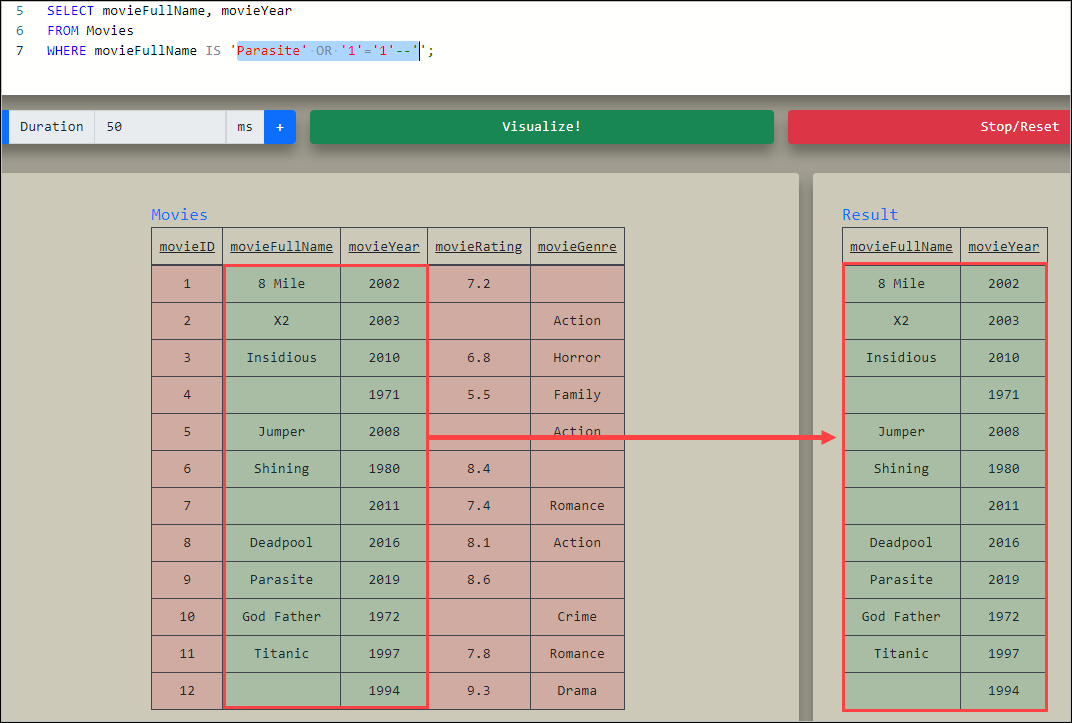구문을 분석하면 사용자가 입력한 데이터는 SQL 쿼리의 작은따옴표(')에 위치한다. 공격자는 WHERE 절의 앞이나 뒤 둘중 하나만 참이되게끔 하기 위해 OR 절을 추가한 것이다. 따라서 WHERE 절은 movieFullName이 'Parasite'이거나, '1'='1'인 경우 SELECT의 movieFullName, movieYear를 출력하도록 했기 때문에 DB 내에 있는 모든 데이터를 출력한다.