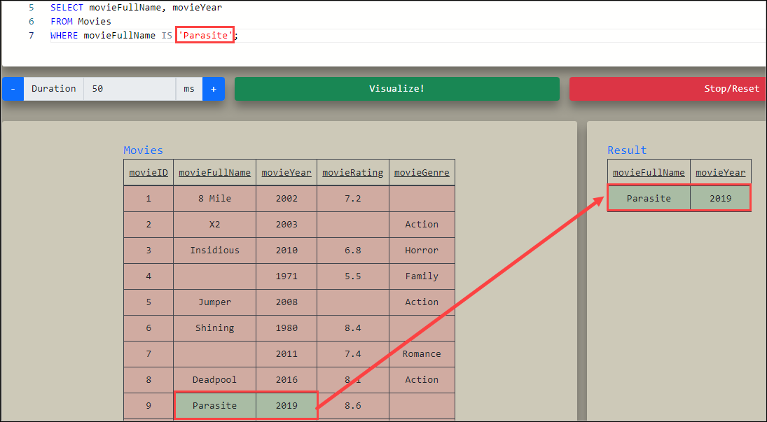 가장 쉬운 SQLi 예제를 아래와 같이 다룬다. 사용자가 Parasite를 검색어로 하여 Movies DB에서 결과를 출력한 모습이다.