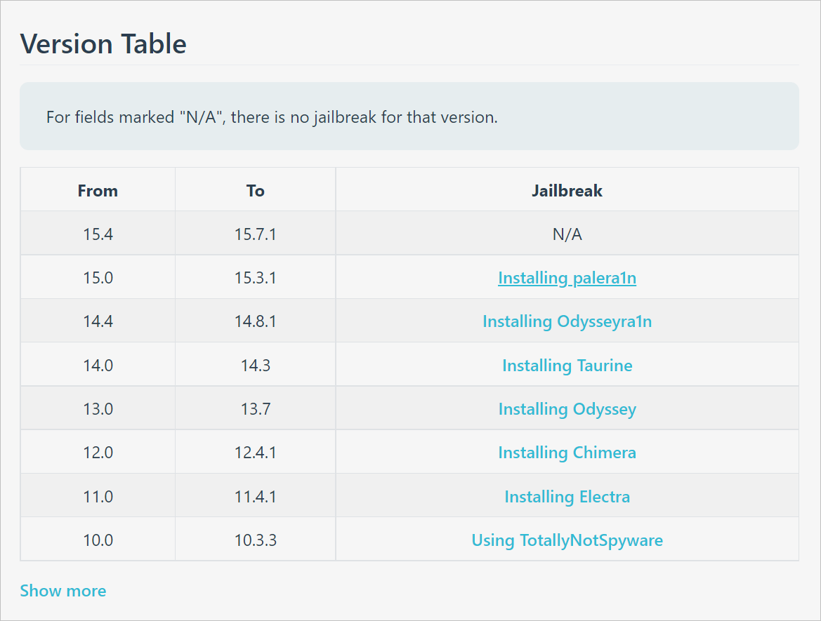 아이폰 7의 경우 탈옥이 가능한 버전이 정해져 있다.(22년 12월 기준 아래와 같다.)