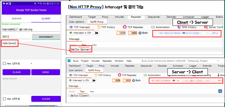 3. 안드로이드 단말기 내 Burp 인증서 설치여부는 관계없다.(TCP 패킷이므로)