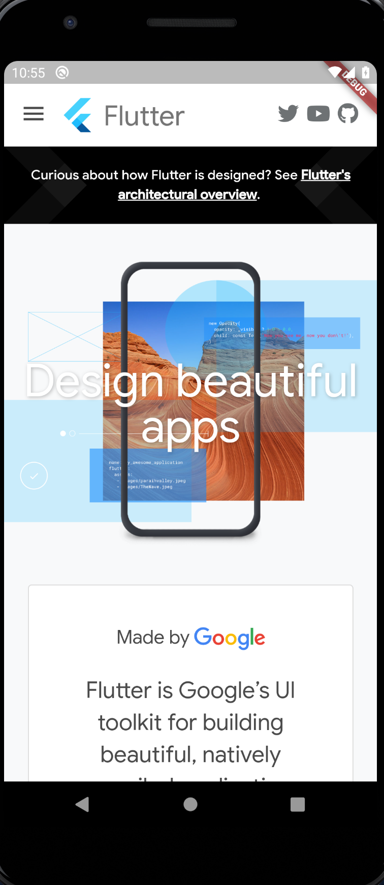 import 'package:flutter/material.dart'; import 'package:webview_flutter/webview_flutter.dart'; void main() => runApp(MyApp()); class MyApp extends StatelessWidget { @override Widget build(BuildContext context) { return MaterialApp( title: 'Webview Demo', theme: ThemeData( primarySwatch: Colors.blue, ), home: MyHomePage(), ); } } class MyHomePage extends StatefulWidget { MyHomePage({Key key}) : super(key: key); @override _MyHomePageState createState() => _MyHomePageState(); } class _MyHomePageState extends State<MyHomePage> { @override Widget build(BuildContext context) { return Scaffold( body: SafeArea( child: WebView( initialUrl: 'https://flutter.dev', javascriptMode: JavascriptMode.unrestricted, ) ), ); } }예전에 실습할 때에는 인터넷 접근권한이 필요했었던걸로 기억하는데 이번엔 묻지 않았다.