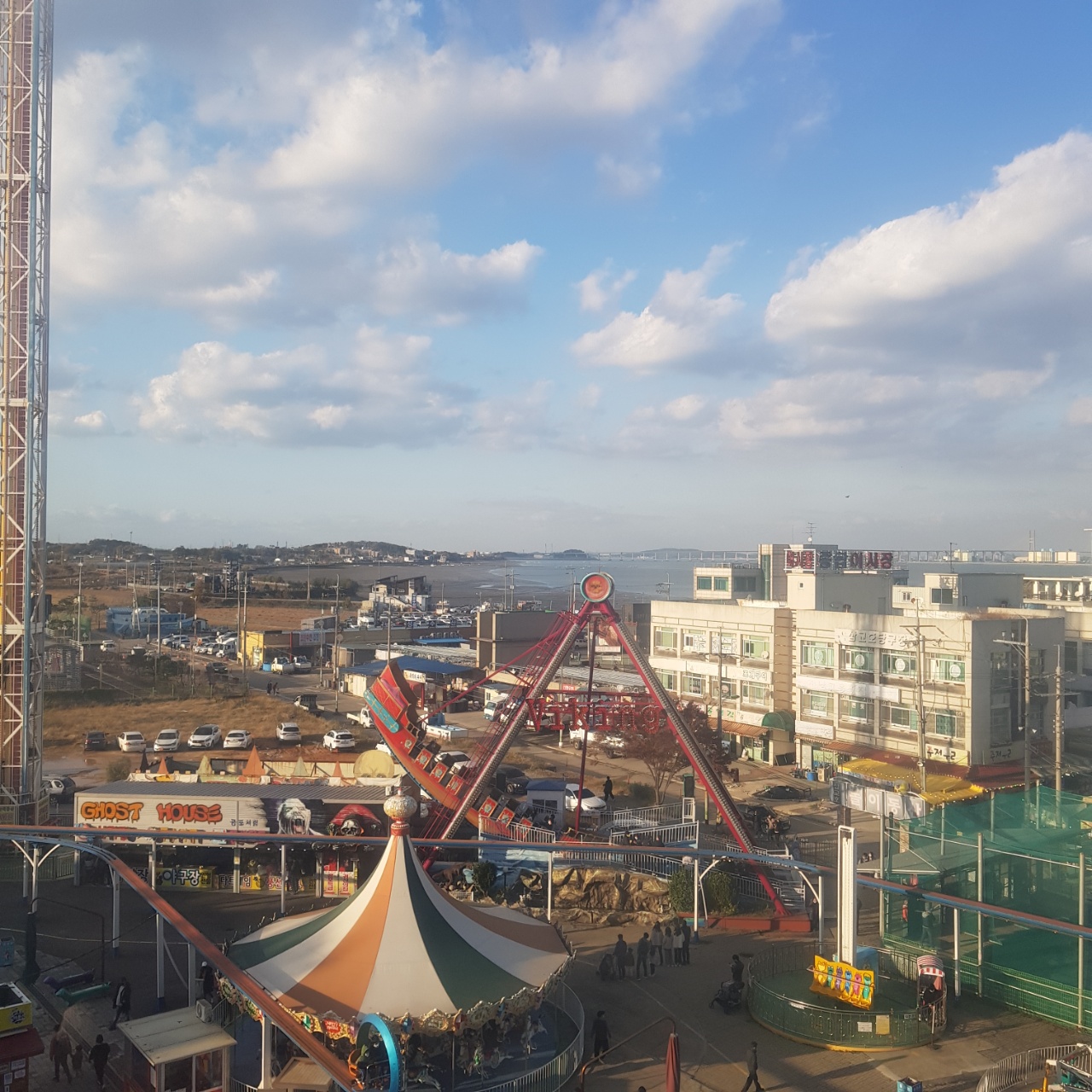 삽교호 자체도 좋지만 남자들끼리의 우정여행이었기 때문에 상남자의 놀이기구인 "관람차"가 있는 삽교호 놀이동산으로 목적지를 정했다. 사람이 너무 붐비지 않으면서, 너무 한가롭지 않은 장소로 적절하다. 바닷가 유원지답게 횟집과 포장마차 등도 많이 있었고 현장에서 바로 숙소도 구할 수있다.
