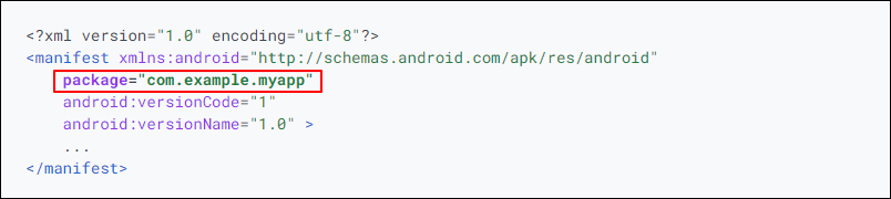 <manifest> 태그에는 앱의 패키지 명, Build 버전, API Level 등이 명시된다. 예제에서는 com.exmple.myapp이 앱의 패키지명이 된다. 지원하는 API Level에 따라 설치가능한 안드로이드 버전이 구분되어 있으며, 지원이 종료된 버전의 경우 API Level에 따라 실행 불가능한 기능이 있거나 설치가 불가능할 수 있다.