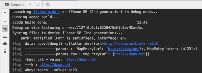다음은 URI스키마를 통해 실행된 앱에서 전달받은 인자들을 콘솔에서 로그로 출력해 보았다.