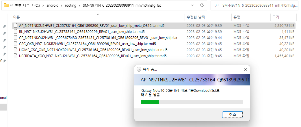 2. PC-단말기를 연결한 후 Magisk.apk와 'AP_'로 시작하는 파일을 단말기에 복사한다.