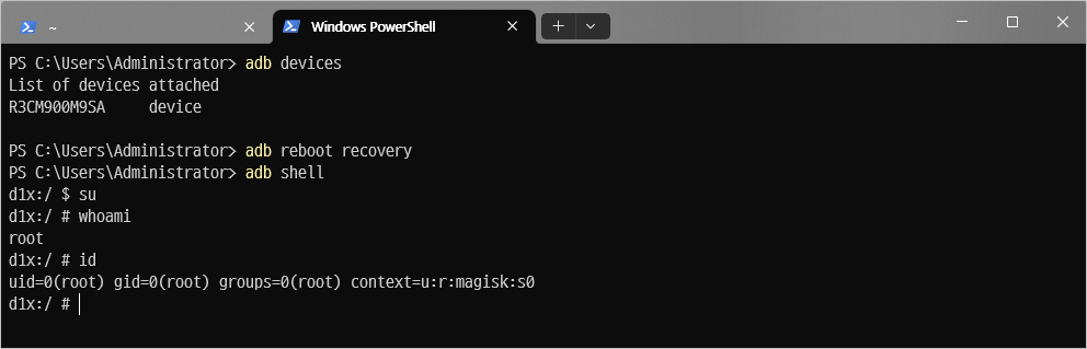Magisk가 /recovery 경로에 설치되어있기 때문에 리커버리 모드로 부팅했을 때에만 root 권한을 사용할 수 있다.