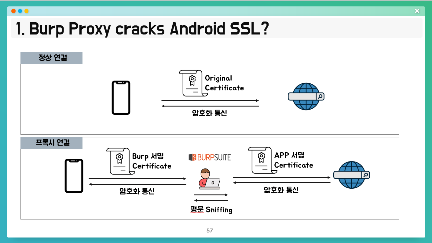 - 단말기 입장에서는 분석가의 Proxy 도구(Burp 등)가 서버가 되어 인증서를 대체한다.