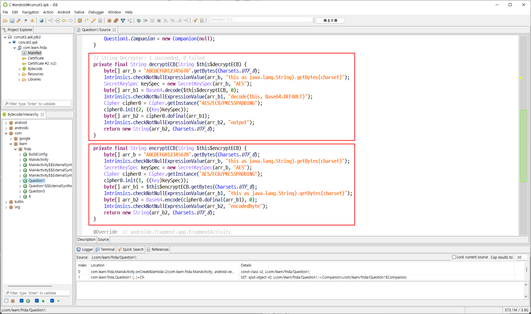 decryptECB()와 encryptECB()함수는 사용자 정의 함수이므로 액티비티 생명주기에 직접적인 영향을 주지 않는다. 좀 더 분석을 해보면 아래에 onCreate() 메소드가 있다.