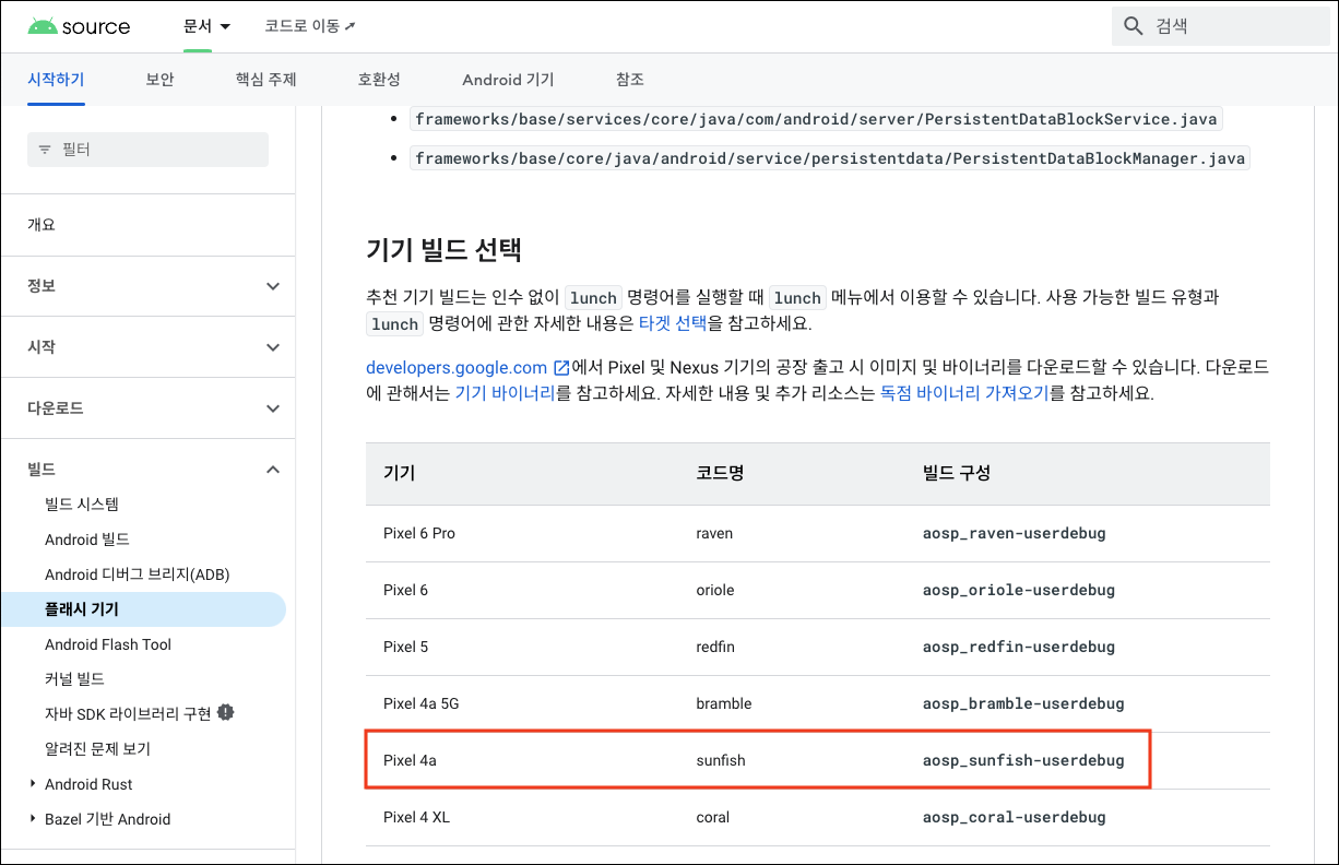 https://source.android.google.cn/docs/setup/build/running?hl=ko 에서 모델별로 빌드 구성 코드명을 선택할 수 있다. 구글이 벤더인 기기(픽셀, 넥서스 등)은 공장 출고 시 이미지를 공개하고 있다. 본문에서는 Pixel 4a 단말을 위한 빌드를 구성한다. 빌드 구성은 aosp_sunfish_userdebug가 된다.