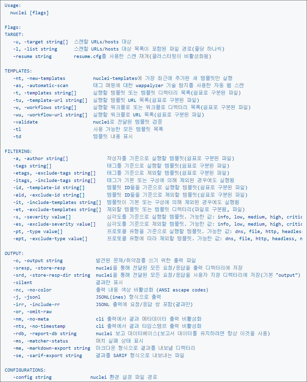 nuclei -h 실행을 통해 설명을 확인할 수 있다.