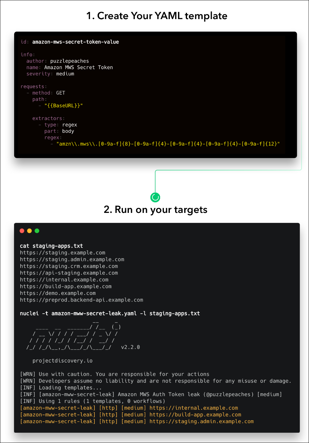 또한, nuclei는 다양한 도구와도 유기적으로 결합할 수 있기 때문에 확장성도 크다. 파라미터 퍼징 도구를 사용하여 템플릿 입력 값으로 넘겨줄 수도 있고, 서브도메인을 찾는 도구와 결합하여 다양한 서브도메인을 대상으로 한 스캐닝도 가능하다.