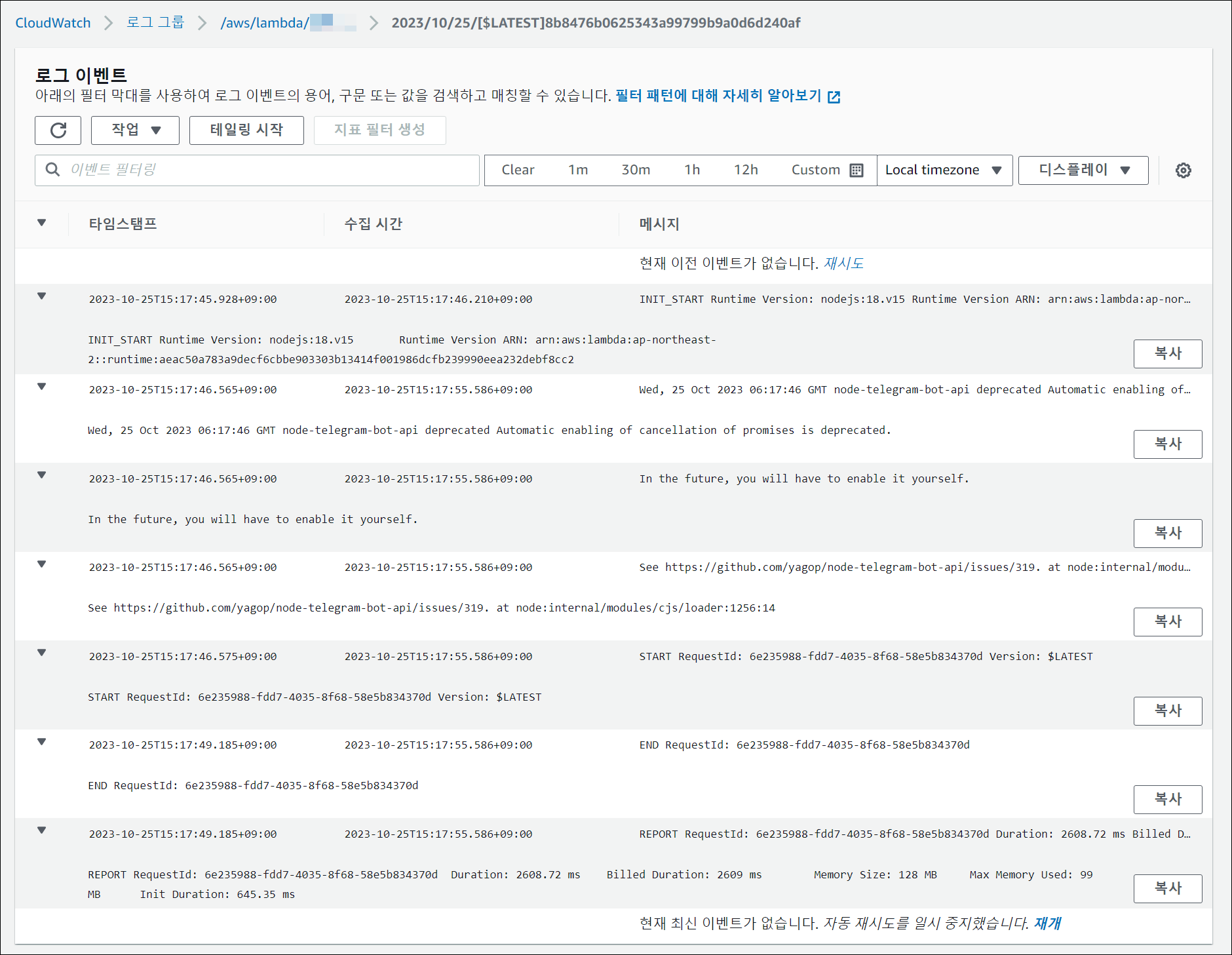 Promise가 성공적으로 실행되었다면 .then() 메서드를 통해서 챗봇 메시지를 전송하게 되며, 예외가 발생한 경우 .catch() 메서드에서 예외처리한다. 온프레미스 환경에서 잘 동작하는 이 코드를 람다에 업로드하고 실행하면 다음과 같은 로그를 확인할 수 있다.