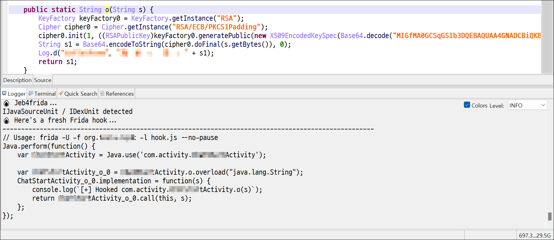 JEB의 Logger에서 후킹 스크립트를 확인할 수 있다.