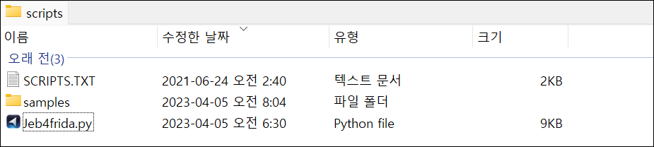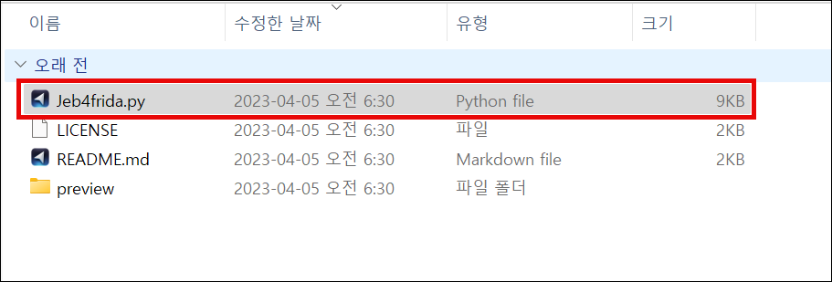 압축파일로 받으면 폴더에 'Jeb4frida.py' 파일이 스크립트 파일이다. 해당 파일을 JEB가 설치된 경로의 '/scripts' 에 복사한다.