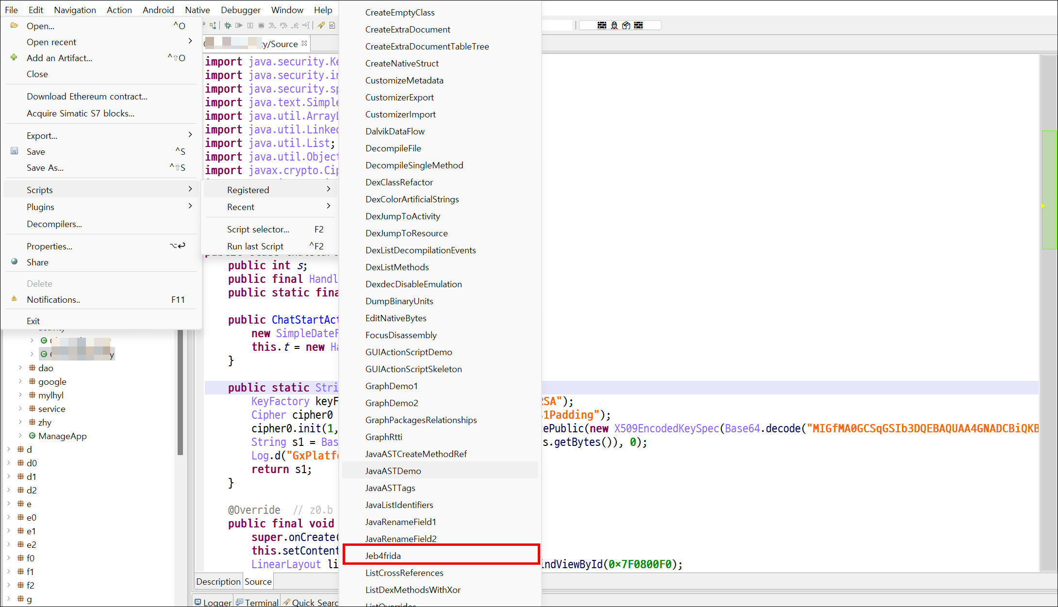 File > Scripts > Registered > Jeb4Frida 선택