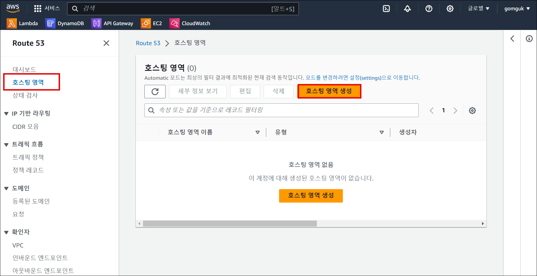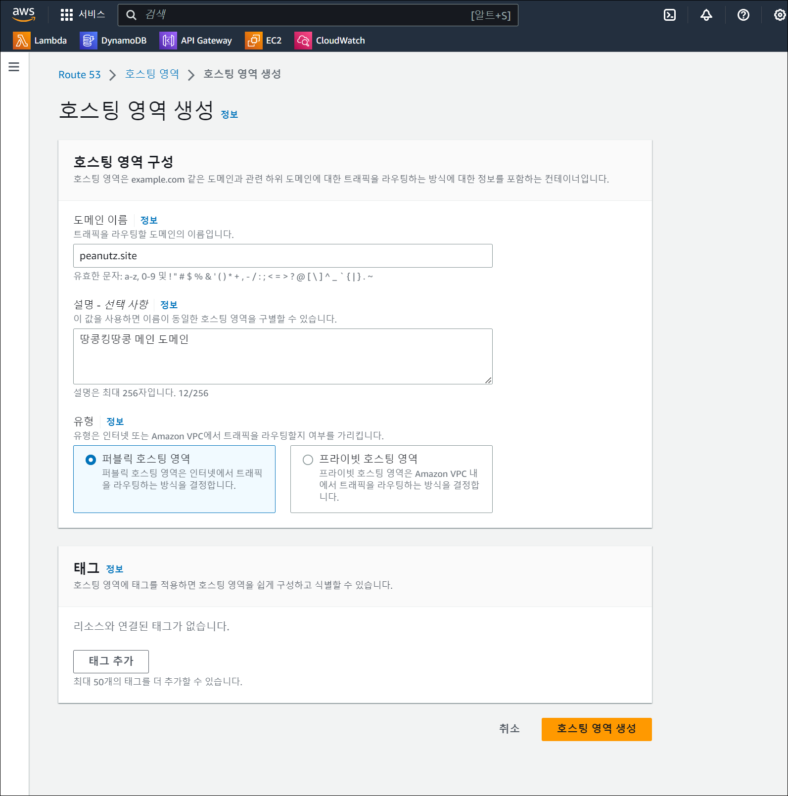 AWS Route 53에서 새 호스팅 영역을 생성하고, 구매한 도메인 이름을 입력