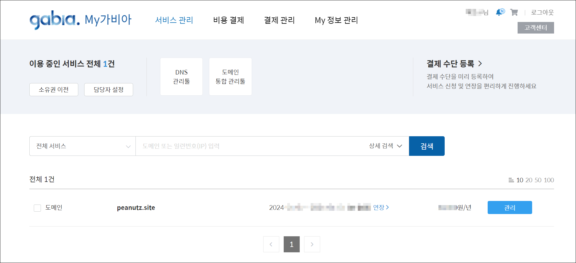 1. (가비아) 가비아에서 도메인 구매 및 관리 메뉴로 이동