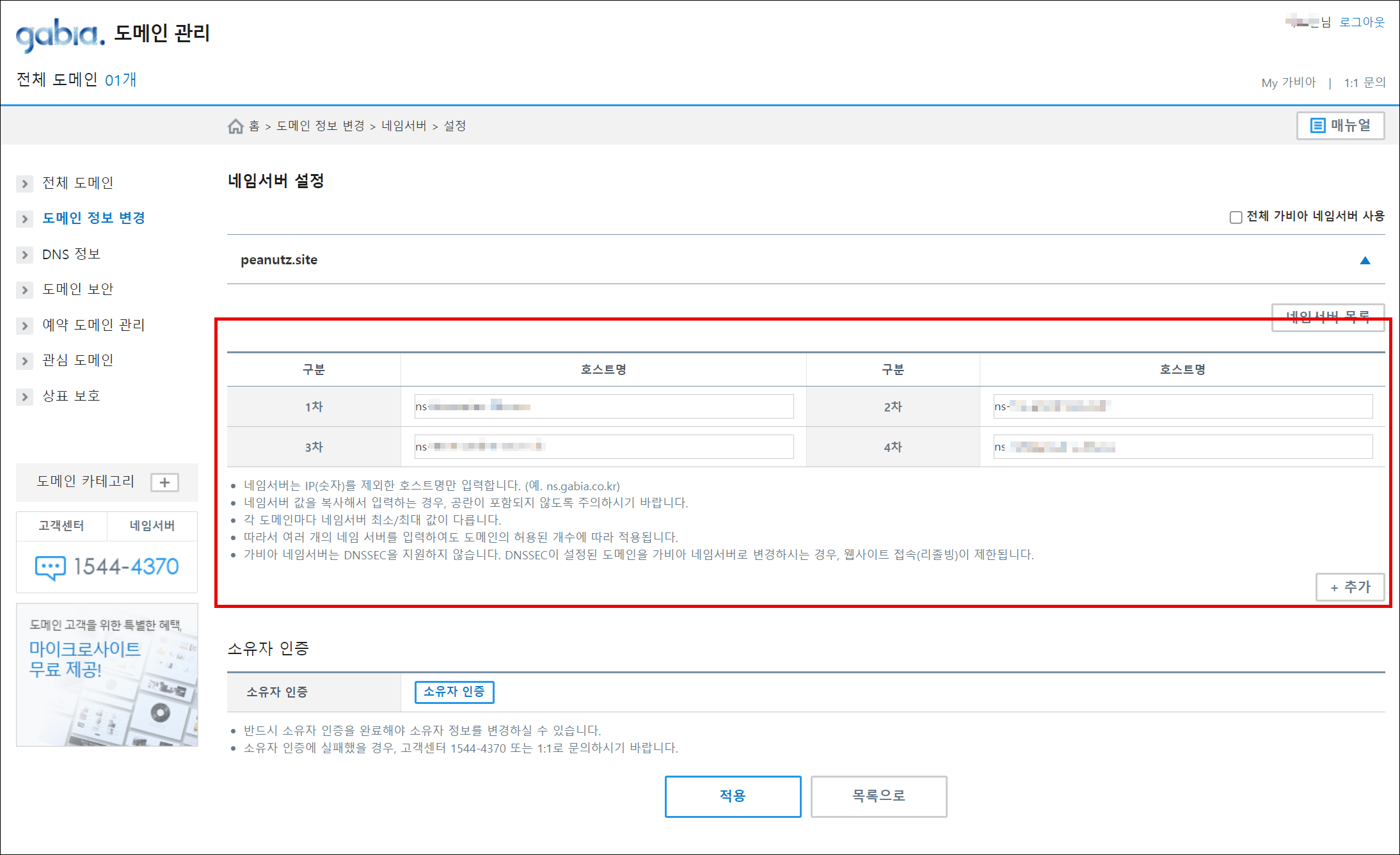 3. (가비아)가비아에서 제공하는 기본 네임서버를 AWS Route53의 네임서버로 변경