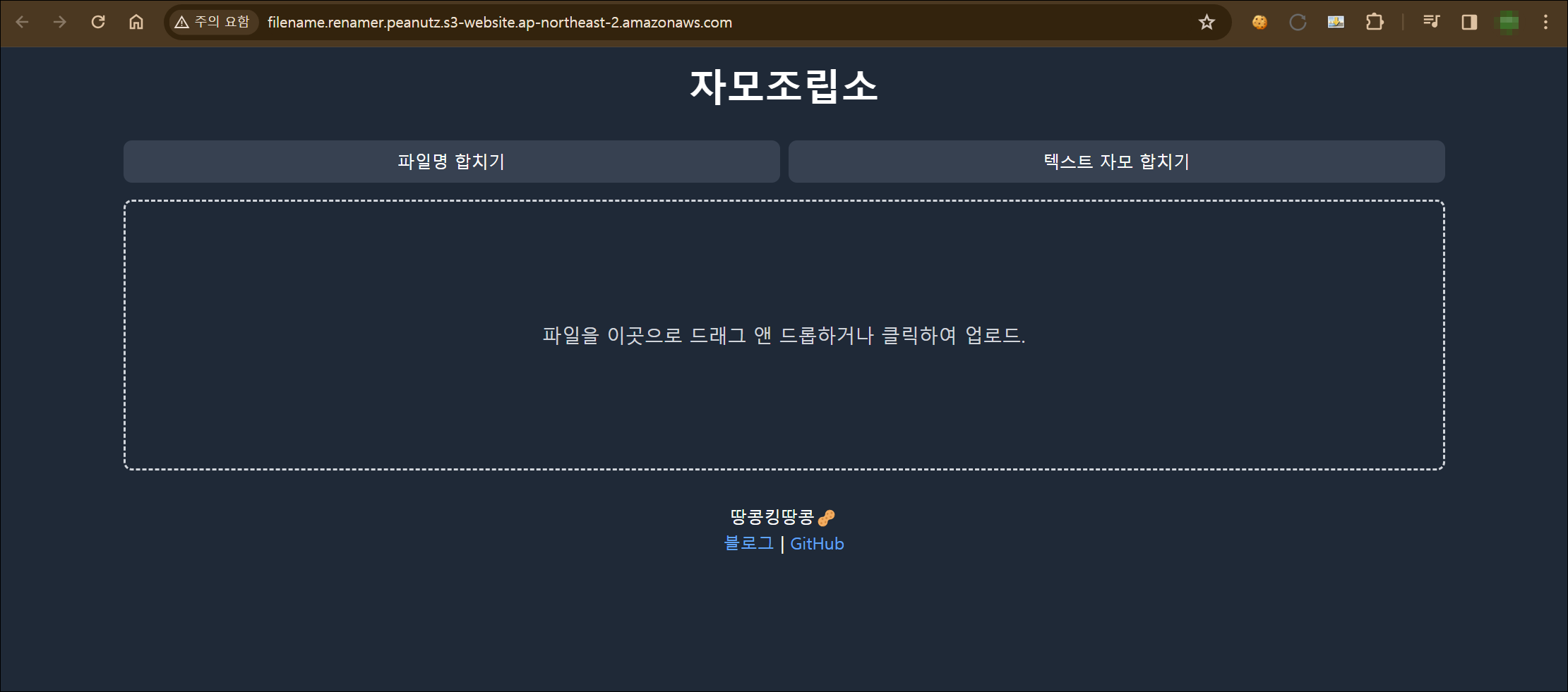 웹 페이지의 샘플 데이터로 사용한 "자모조립소"는 깃허브 페이지(https://github.com/colfax0483/win_file_renamer)에 공개되어 있다.