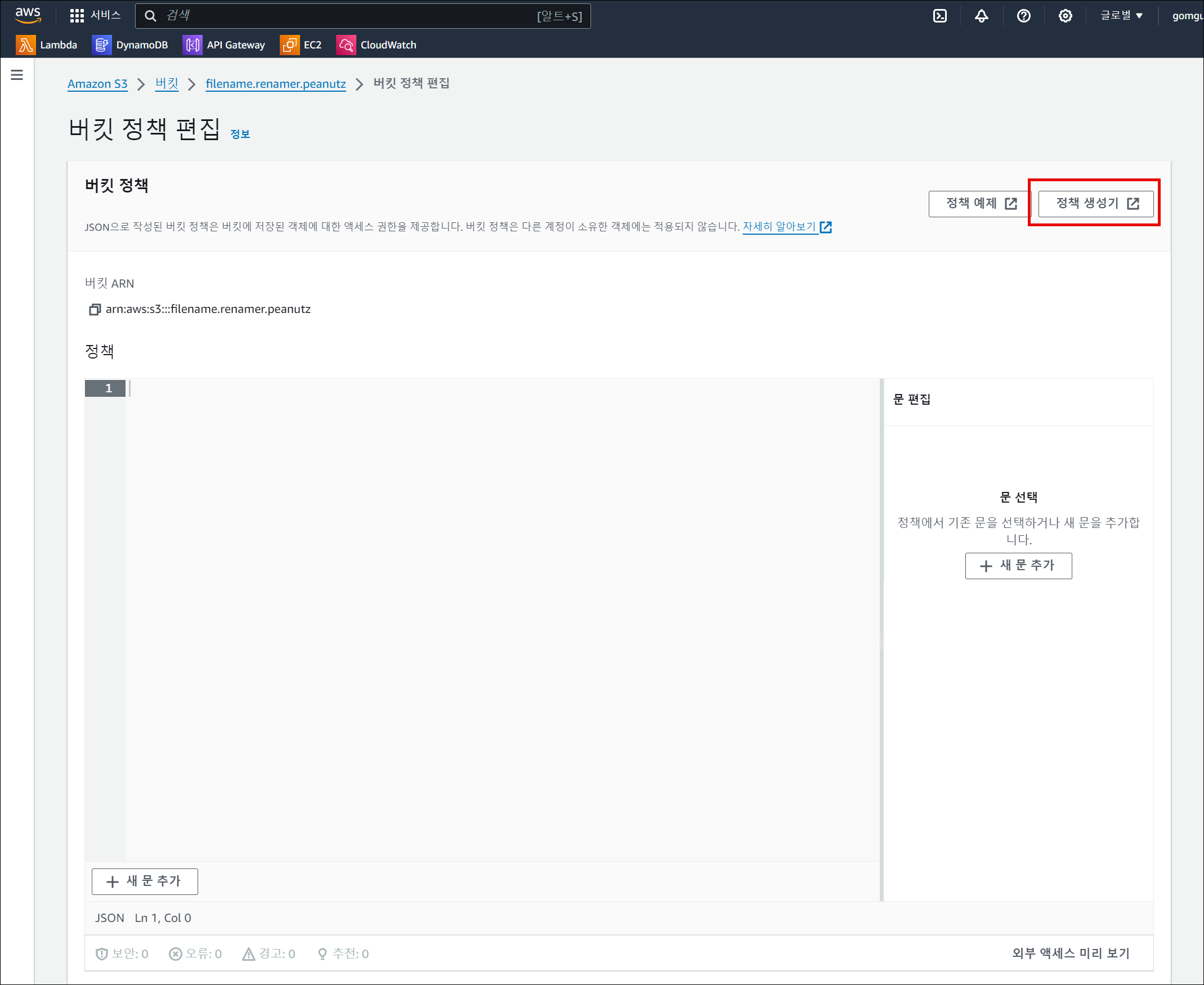 버킷이 생성된 후에 "권한" > "버킷 정책" > "편집" 으로 진행한다.