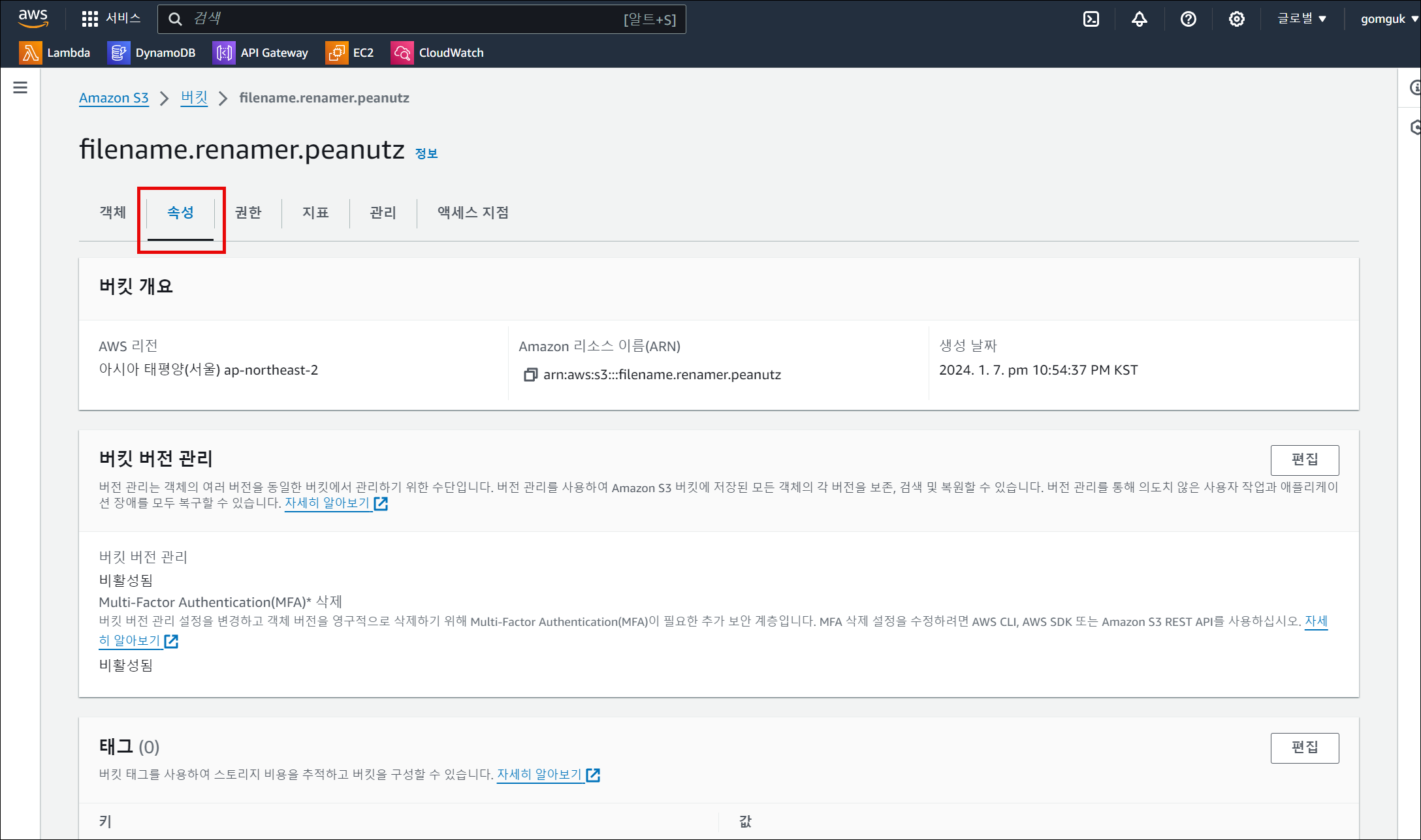 리전을 선택하고 S3 서비스로 접근한 후 '버킷 만들기' 메뉴를 통해 새로운 버킷을 생성한다.