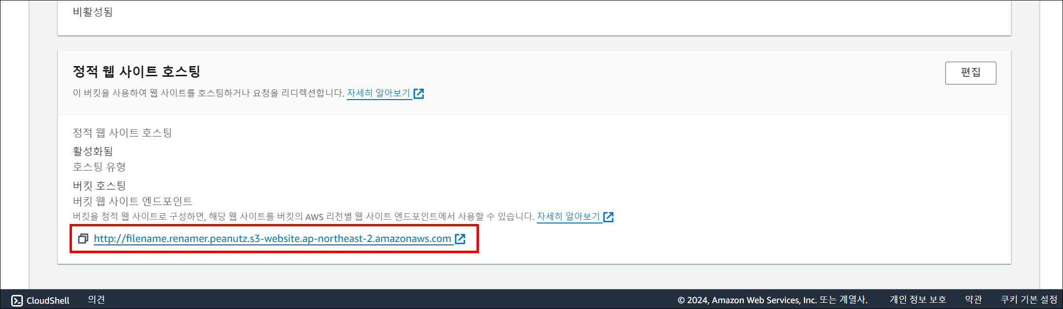 설정을 완료한 후에는 버킷 웹 사이트 엔드포인트 주소를 확인할 수 있다. URL에 접근하여 정상적으로 접근이 되는지 확인한다.
