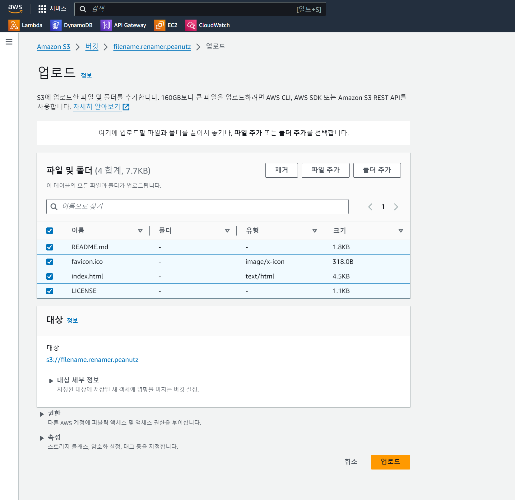 버킷 설정을 완료했다면 웹 리소스 구성 파일들을 업로드한다.
