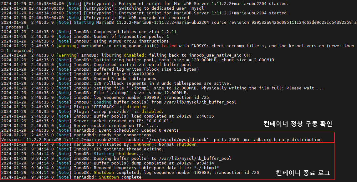 컨테이너 로그: mariadbd (initiated by: unknown): Normal shutdown