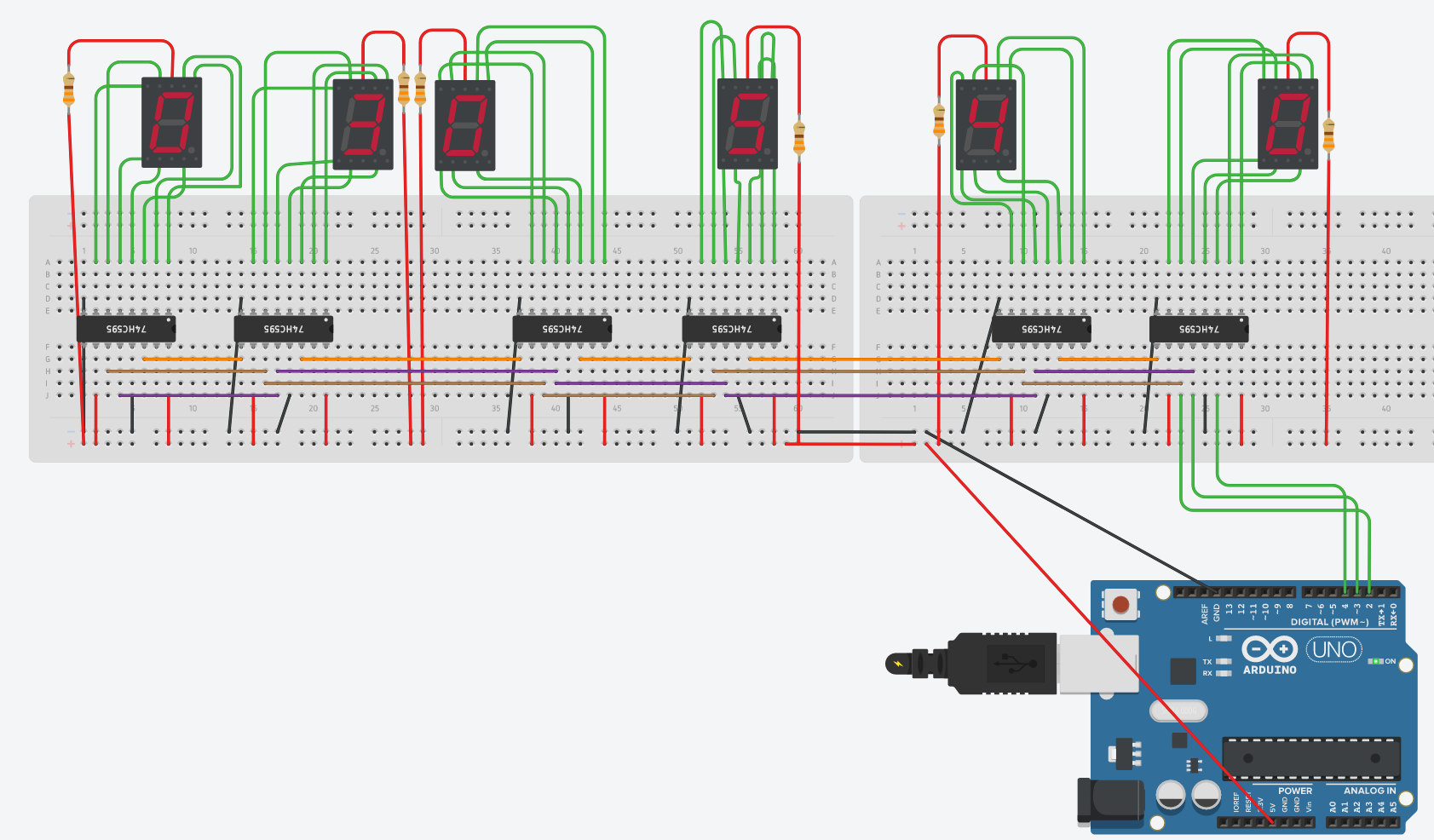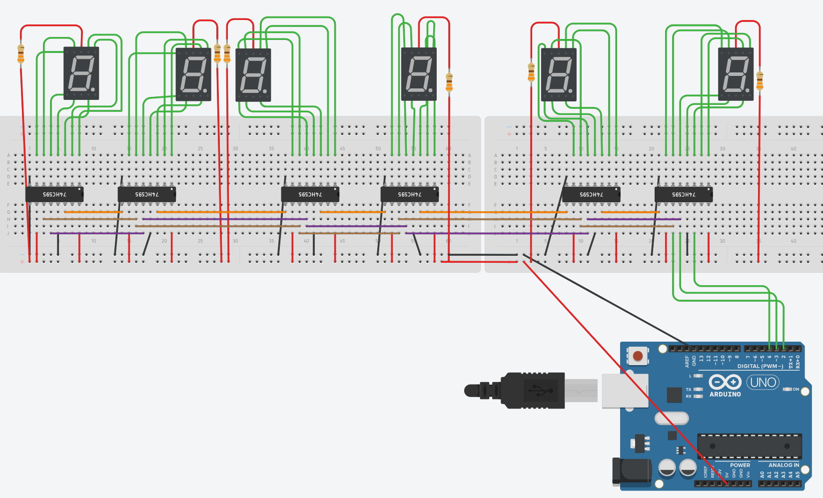 아두이노의 2번 출력이 clockpin, 3번은 latch pin, 4번은 data pin과 연결해 준다. 두 번째 레지스터와 직렬로 연결하기 위해 clock pin과 latch pin은 그대로 연결해 주고 첫 번째 레지스터의 반전된 출력을 두 번째 입력으로 연결한다. 3개 이상의 레지스터를 연결하기 위해서는 위의 과정을 반복해주면 된다. 레지스터의 출력 핀과 7-segment를 위치에 맞게 연결하고 전원을 연결해주면 회로가 완성된다.