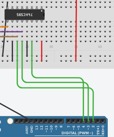 74HC595를 직렬로 구성하기 위해서 먼저 첫 번째 레지스터와 아두이노를 연결한다.
