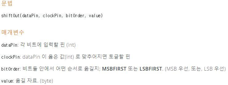 shiftOut()은 한 번에 한 비트씩 바이트를 옮긴다. 최고(가장 왼쪽)또는 최저(가장 오른쪽)비트부터 각 비트에 클락(clock)핀은 하이(High)로 풀(Pull)되고, 다음 비트는 데이터 라인에서 읽히고 클락 핀은 로우(Low)된다. 각 비트는 차례대로 핀에 써지며, 각 클락 핀이 펄스되어(High이면 Low) 비트가 사용 가능함을 가리킨다. shiftOut()으로 데이터를 레지스터에 넣은 후 Latch를 Low에서 High로 변경하면 레지스터의 데이터가 보여지는 것이다.