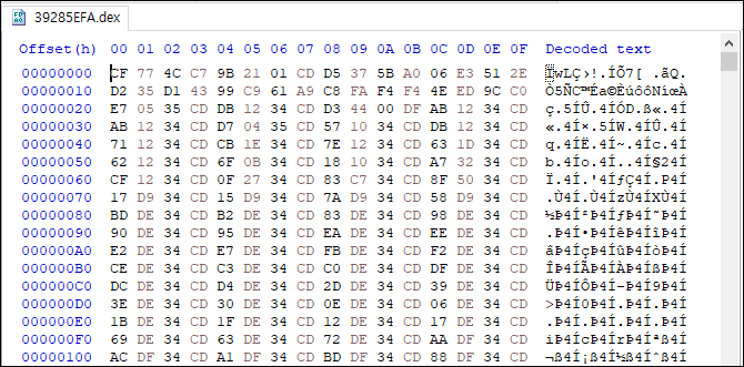 샘플 앱의 경우, '/assets' 경로 내 동적 로딩을 위한 .dex 파일이 위치하고 있으며, 내용은 암호화되어 있음을 확인한다. 앱 내부에서만 접근 가능한 저장소에 암호화한 dex 파일을 저장하고 배포하여 설치 시에 복호화 후 로드하는 "동적 DEX 로딩(Dynamic DEX Loading)" 방식이다.